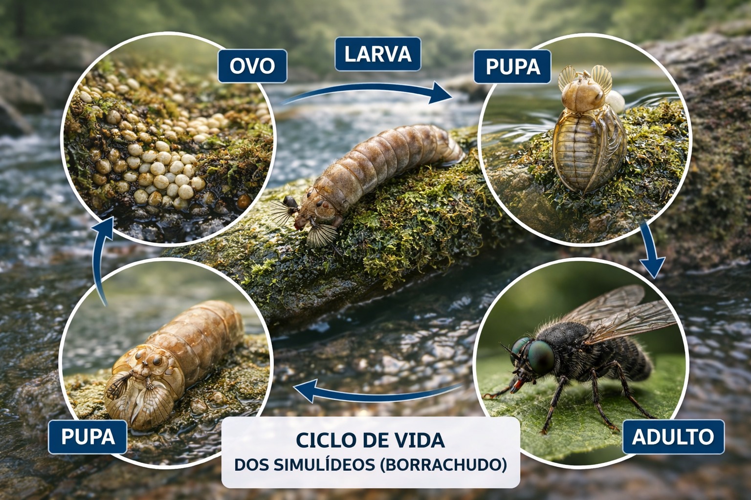 O ciclo de vida dos simulídeos é holometábolo (metamorfose completa):